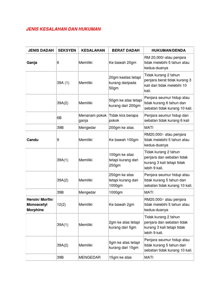 Jenis Kesalahan Dan Hukuman Dadah from imgv2-2-f.scribdassets.com Iv) memasukkan segala jenis dadah yang baru ke dalam akta ini bagi tujuan mengawal pengeluaran, bekalan dan pemilikannya. Namun, pengedaran dadah dilihat sebagai kesalahan yang lebih berat dan di beberapa negara yang lain, hukuman yang agak dahsyat dan kejam dijatuhkan bagi pesalah dadah. 8/4/2019 jenis dadah dan kesannya. Metamphetamine adalah tersenarai di bawah akta dadahberbahaya 1952 (pindaan 1998) dan berkuatkuasa pada 15.9.98 mengikut akta a 1025. Banyak hal yang berkaitan dengan dadah sentiasa menjadi bahan dalam berita. Hukuman minima adalah 20 tahun penjara dan 15 kali sebat dan hukuman maksima. Penyalahgunaan dadah adalah satu kesalahan yang amat berat di kebanyakan negara. 4 dalam dibidang perubatan, dadah jenis ini digunakan sebagai ubat penenang, meredakan kesakitan dan untuk tidur lena.